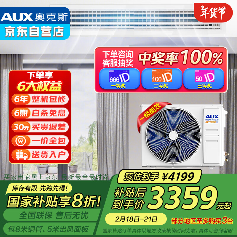 奥克斯(AUX)风管机一拖一大1.5匹中央空调1级能效 卿享全直流变频卧室空调 以旧换新补贴GRD36/BPR3QA-QF3(B1)价格:4199.00元!