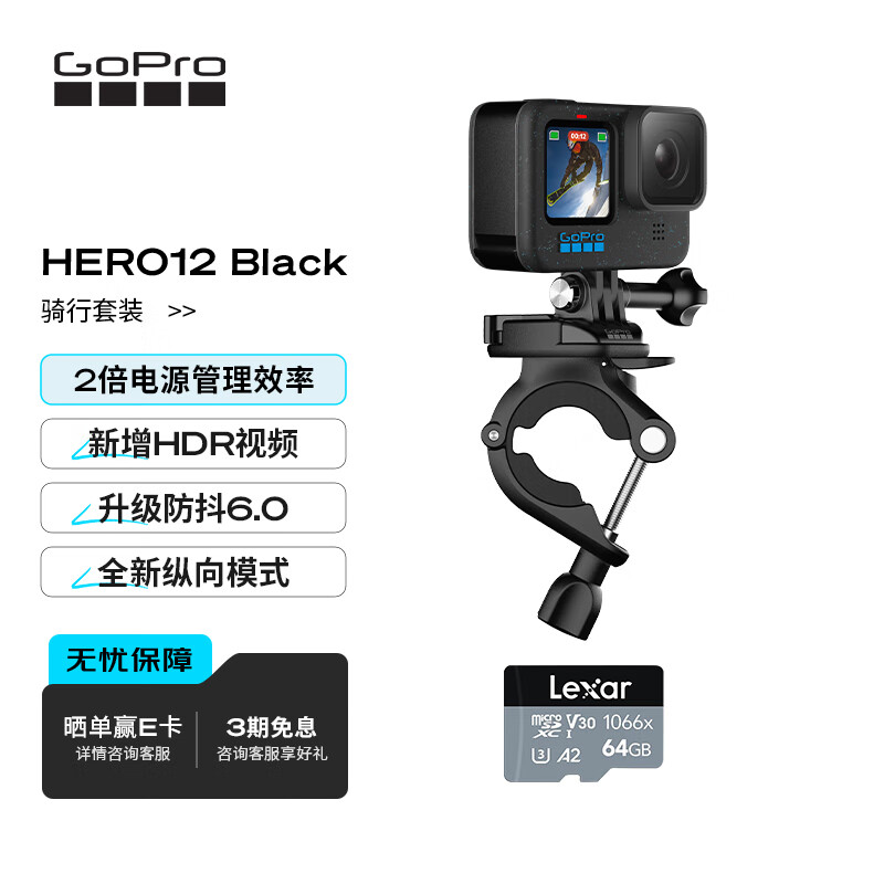 GoPro HERO12 Black运动相机 户外潜水滑雪防抖相机 防水vlog照相机 户外骑行套装【手把固定座+64G卡】价格:2288.00元!