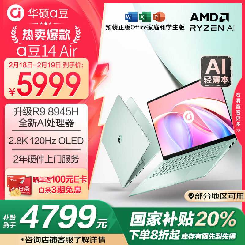 华硕a豆14 Air 补贴20% 高性能AI超轻薄笔记本电脑(R9 8945H 32G 1T 2.8K 120Hz OLED护眼屏) 青价格:5999.00元!