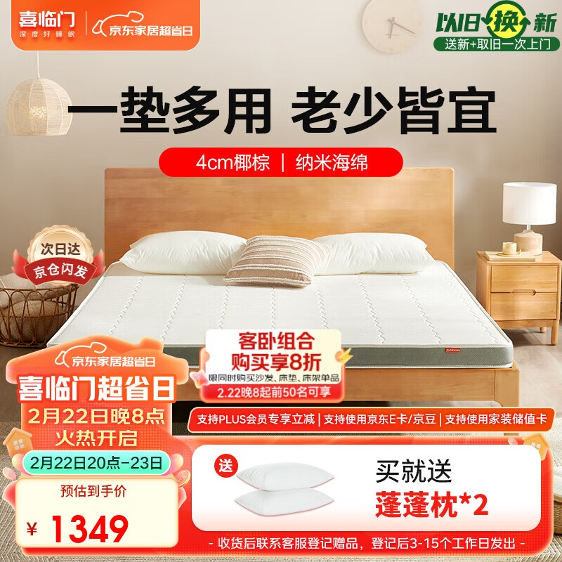 喜临门薄垫 4cm椰棕床垫 A类针织面料青少年老人床垫 伊菲H10 1.8x2.0米价格:1349.00元!