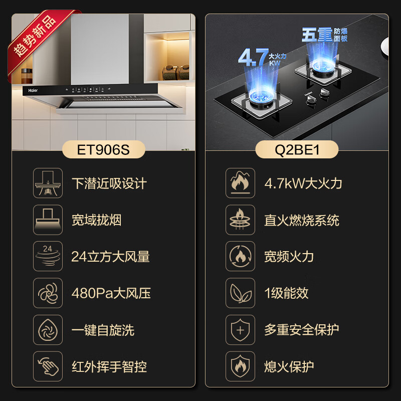 海尔(Haier)油烟机 抽油烟机燃气灶套装 新欧式下潜近吸24立方挥手智控 4.7kw猛火烟灶套装ET906S+BE1天价格:2199.00元!