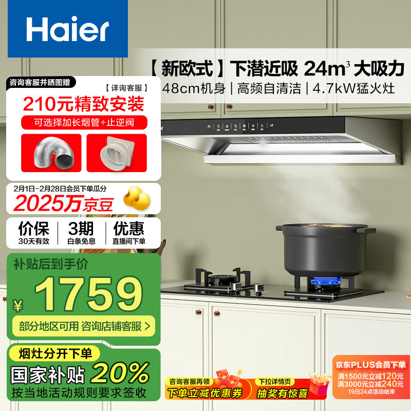 2、618买了新欧式系列下潜近吸油烟机,海尔的售后没话说,很快就给安装好了,还给改了烟道,理顺了方向,使用下来太满意了!!24立方大吸力,比我的旧烟机效果好多了!!
