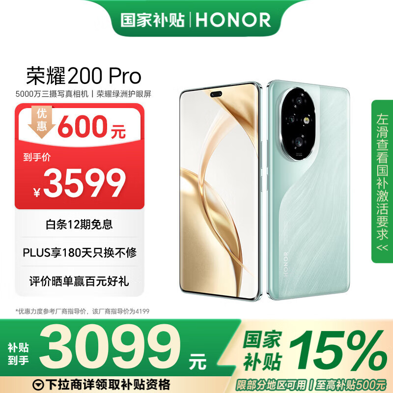 荣耀200 Pro 旗舰级青海湖电池 绿洲护眼屏 雅顾光影主摄 16+1T 天海青 拍照 AI 新款5G手机 政府补贴价格:3599.00元!
