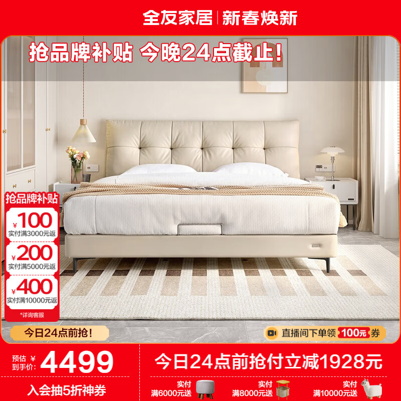 全友家居 简约风头层牛皮艺床2x2.2米大户型主卧软包真皮双人床116026价格:6427.14元!