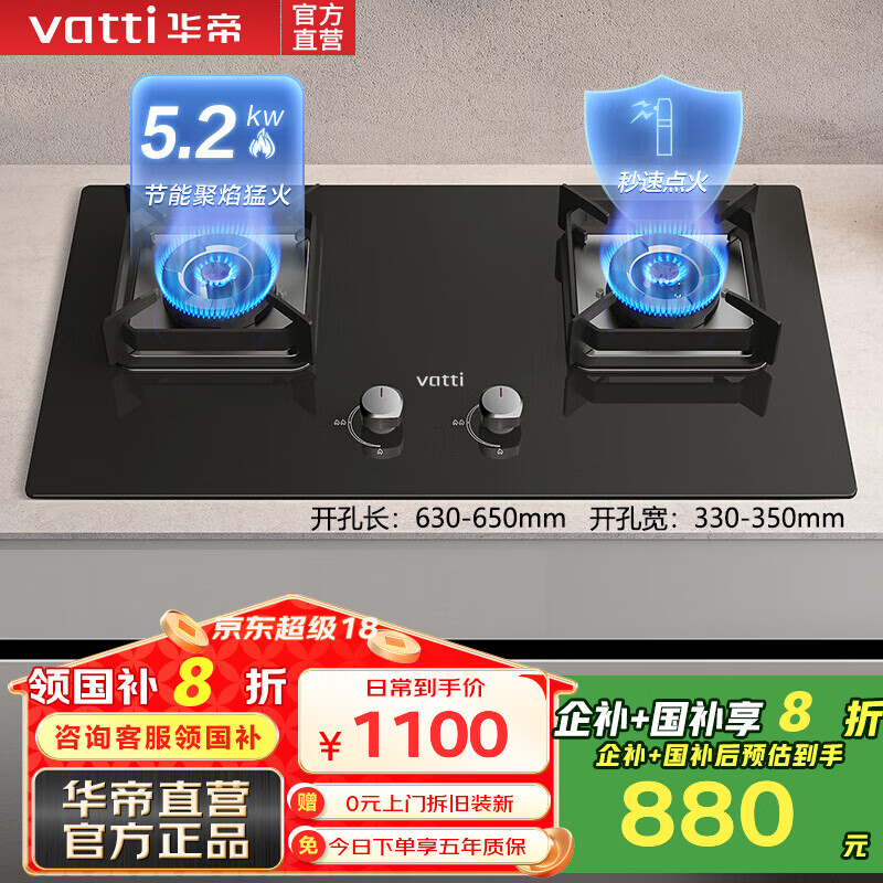 华帝(VATTI)i10073B燃气灶官方嵌入式台式双灶具5.2kw猛火灶台多档火力精控一级能效易清洁 燃气灶 液化气5.0KW价格:1100.00元!
