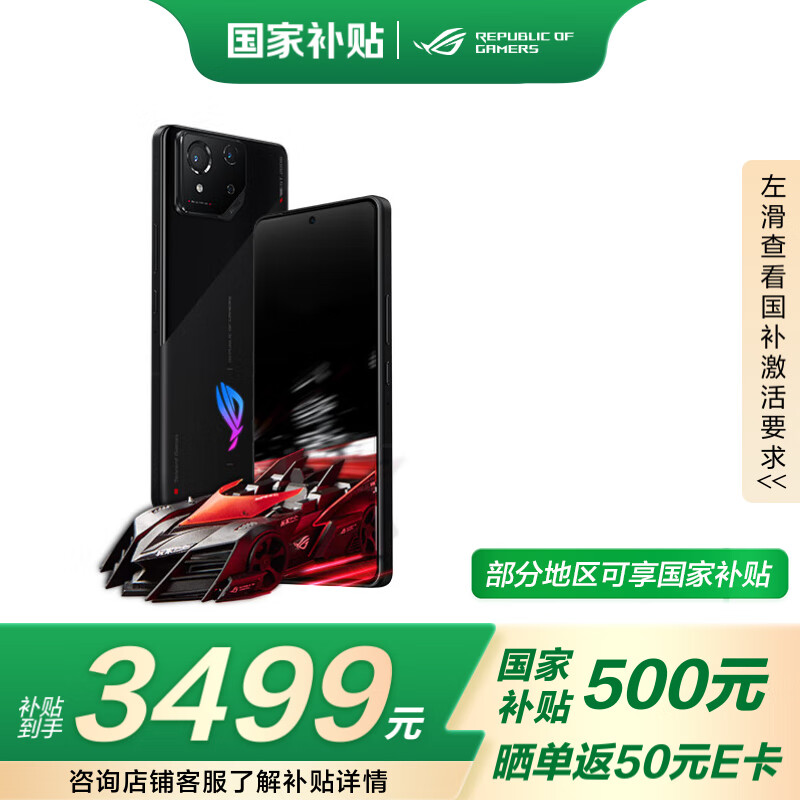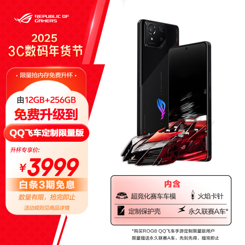 ROG8 AI游戏手机 补贴 QQ飞车手游定制限量版12+256曜石黑 骁龙8Gen3 165Hz【内存升杯】价格:3999.00元!