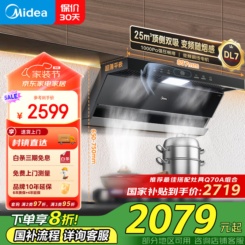 美的(Midea)抽油烟机 家用顶侧双吸25风量大吸力 变频随烟感新静吸7字型排油烟机 DL7补贴以旧换新价格:2599.00元!