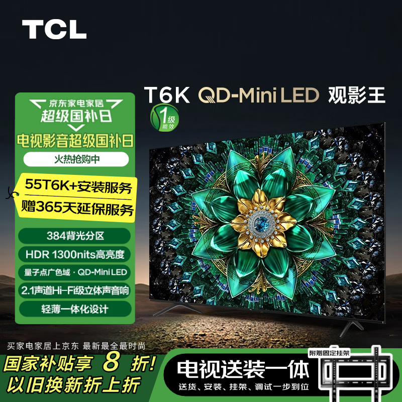 TCL 55T6K 包安装版【固定挂架送装一体】55英寸 QD-Mini LED电视 T6K+安装服务含挂架价格:2698.00元!