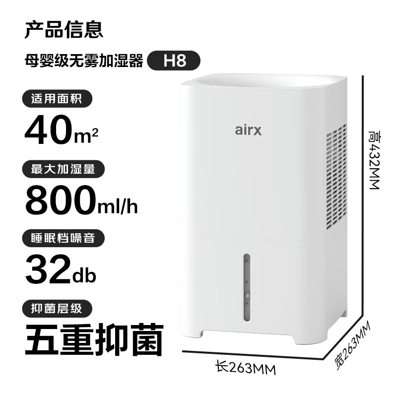 想了解airxH8挺好的,外形设计:外观中规中矩,显示屏比较前卫水箱容量:水量容量大,不用频繁加水运行声音:声音很小,特别睡眠模式基本就是无声加湿效果:加湿效果很好,起床不会感觉干燥其他特色:上加水比较方便