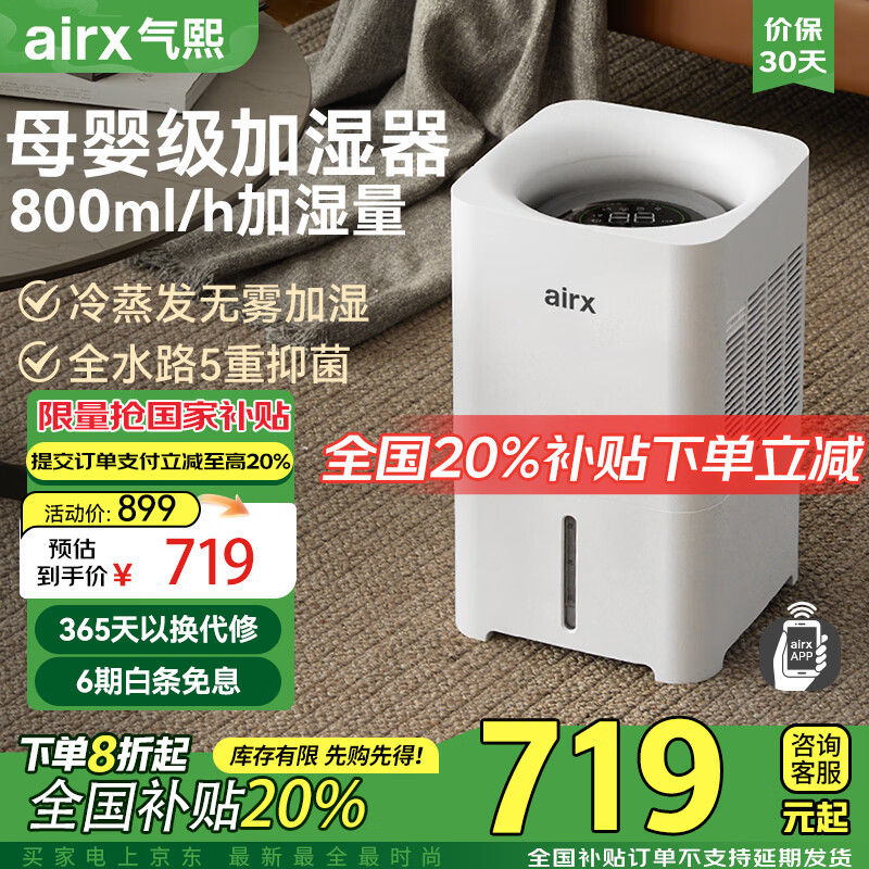 气熙(airx)无雾加湿器 卧室家用办公室孕妇婴儿空气加湿 6L大容量 上加水 800ml/h加湿量H8【家电补贴】价格:899.00元!