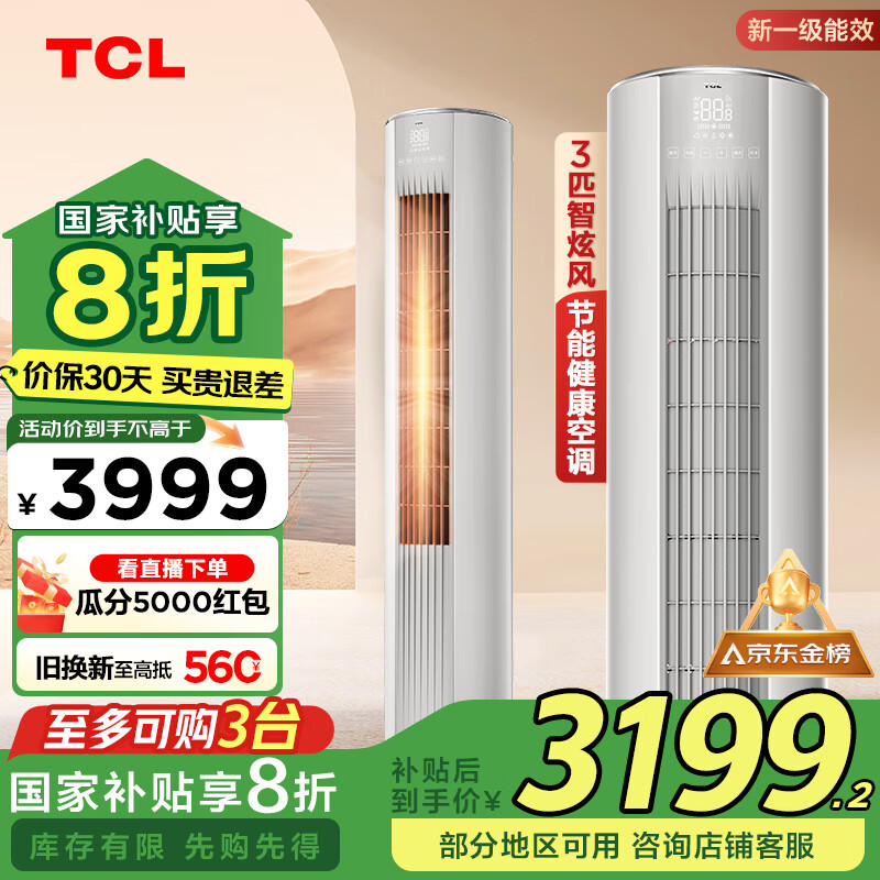TCL空调3匹新一级能效节能变频冷暖智炫风空调立式空调柜机KFRd-72LW/D-ME21Bp(B1)以旧换新补贴价格:3799.00元!