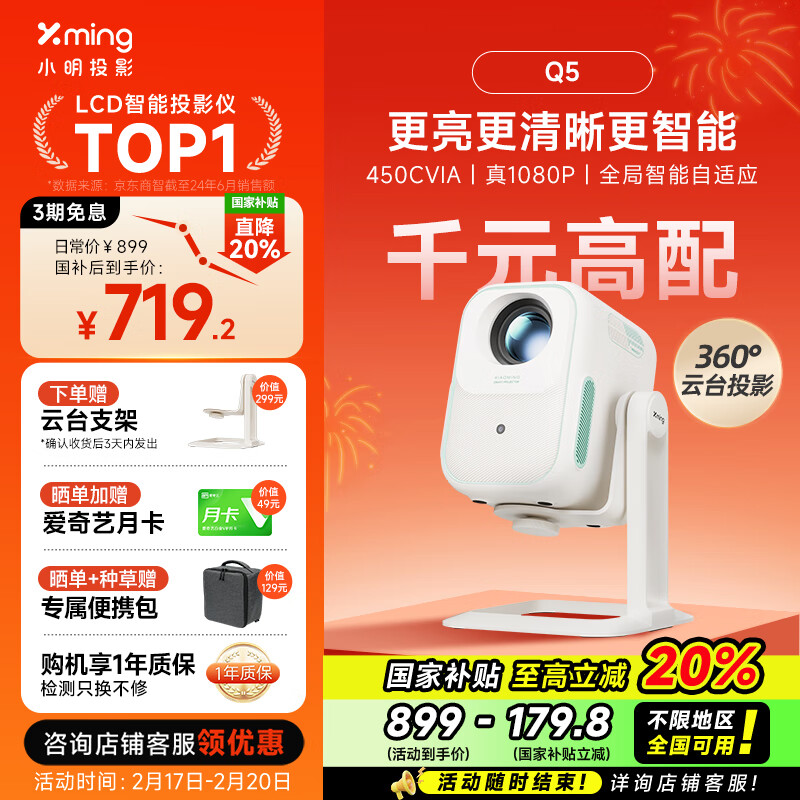 小明 Q5 升级云台投影仪家用便携户外1080P高清家庭影院游戏投影机(450CVIA流明 已接入米家)价格:899.00元!