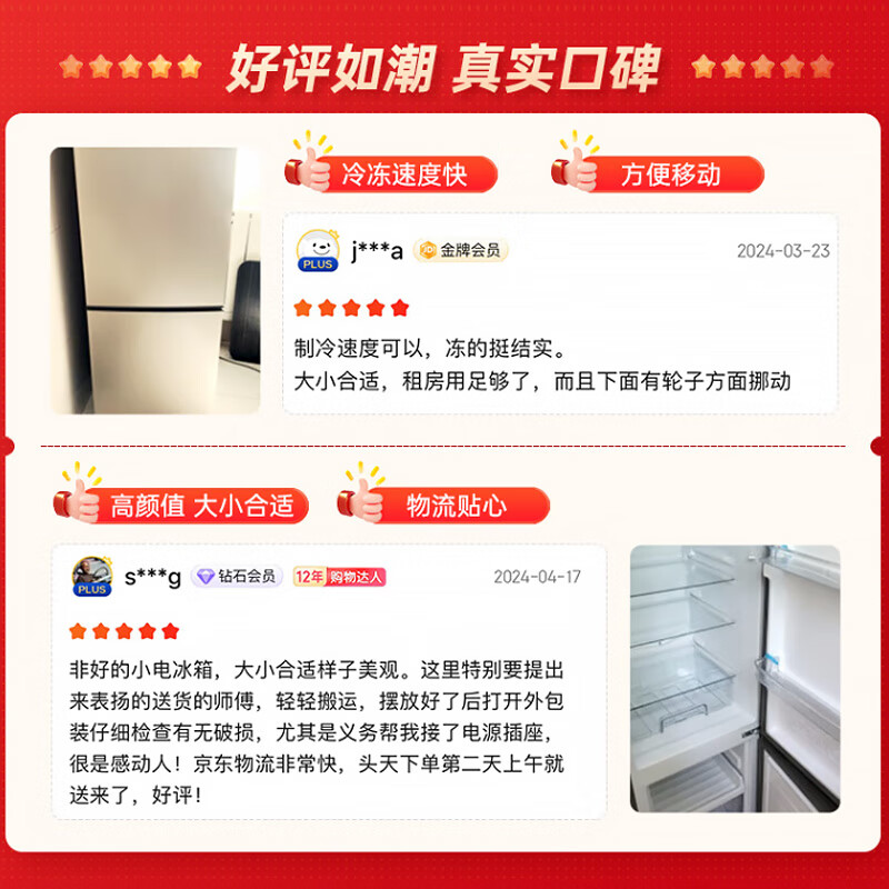 4、物流很快,送货员非常好。东西包装的很好,试用了几天,嗓音小,制冷和保鲜效果都不错,外观也好看,只是容量没有想象中的那么大。