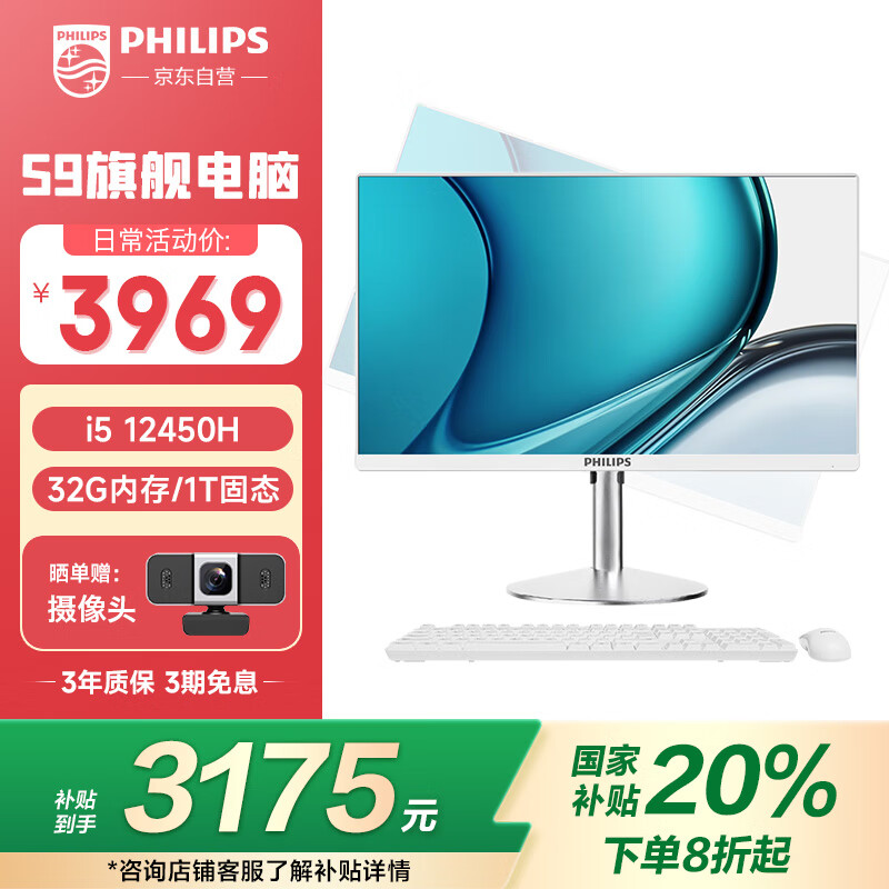 飞利浦(PHILIPS)S9 补贴20% 27英寸一体机电脑台式机办公主机(12代i5 12450H 32G 1TB WiFi 三年质保)白价格:3969.00元!