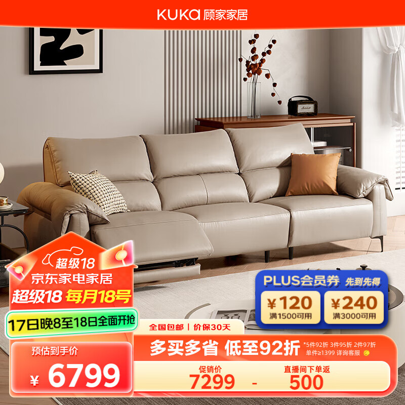 顾家家居(KUKA)【云端系列】意式零靠墙电动功能沙发客厅6212 燕麦色3人位右电动价格:7299.00元!