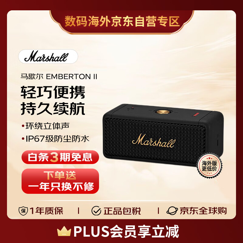 MARSHALL(马歇尔)EMBERTON II音箱便携式2代无线蓝牙家用户外防尘防水小音响 送礼 礼物emberton2 黑金色价格:919.00元!