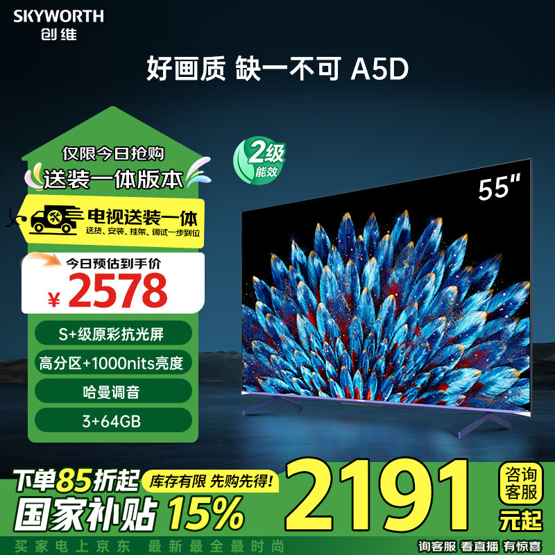 创维电视55A5D 安装版【固定挂架送装一体】55英寸电视机3+64G哈曼调音1000nits彩电护眼平板游戏电视价格:2578.00元!
