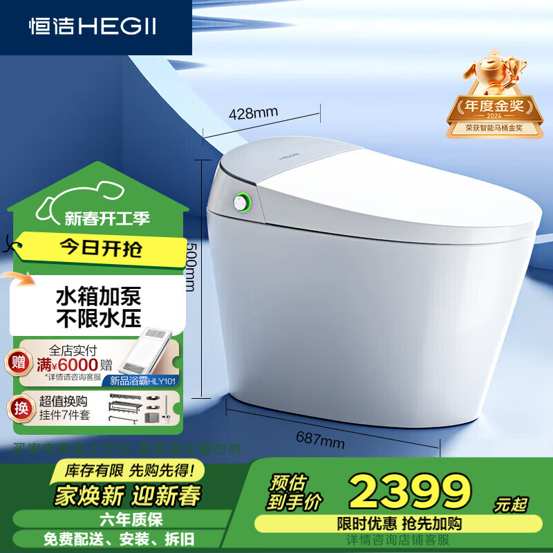 恒洁(HEGII)智能马桶H33 内置水箱不限水压抗菌智能坐便器HCE865A01-305mm价格:2699.00元!