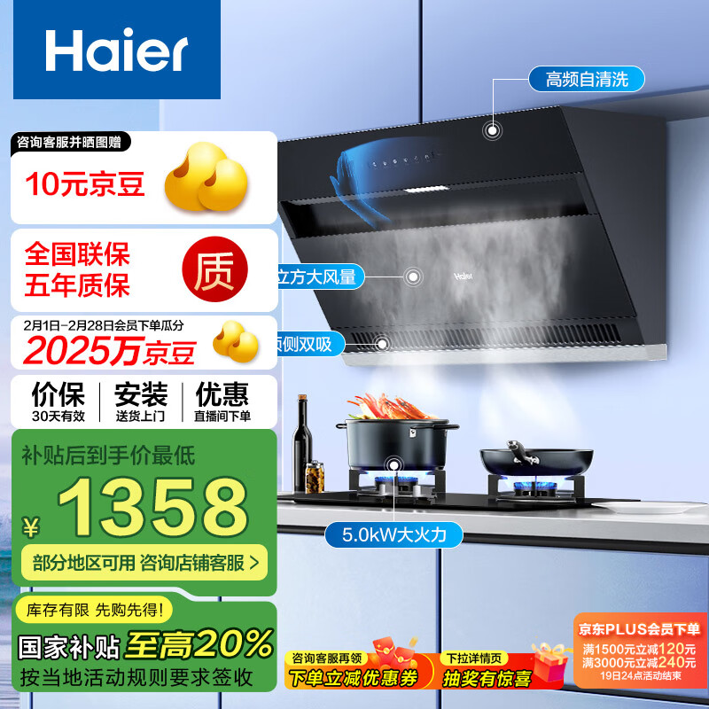海尔(Haier)抽油烟机 顶侧双吸厨房烟灶套装 20m3/min大吸力 家用侧吸式油烟机灶具套装C6JS+Q2BE2天价格:1698.00元!