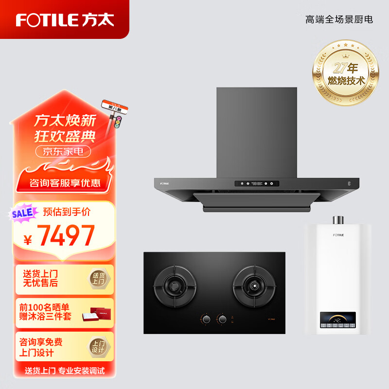 方太(FOTILE)家用欧式烟灶热三件套 25风量超薄变频烟机 5.2kW防干烧灶 16升水伺服热水器F3-G+THK21B+S16D1价格:7497.00元!