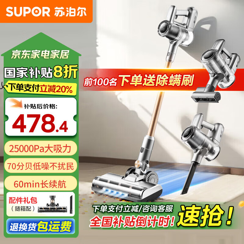 苏泊尔(SUPOR)吸尘器家用【180°躺平】无线手持吸尘器大功率轻量60分钟长续航宠物家庭神器C10SE【补贴8折】价格:598.00元!