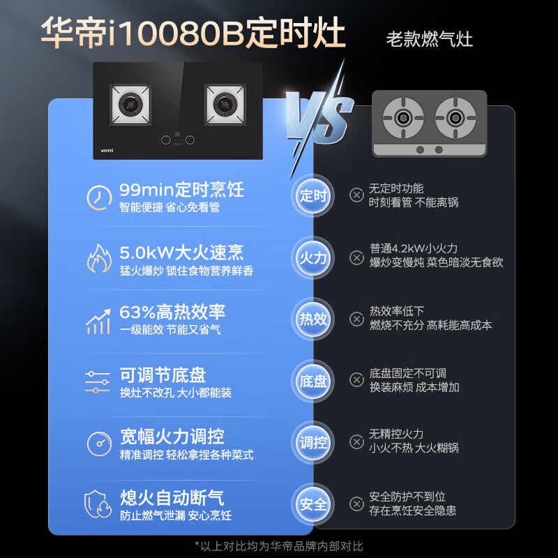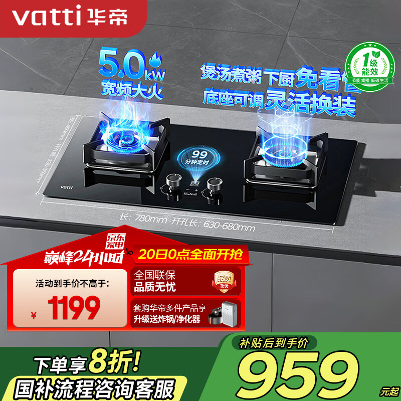 华帝(VATTI)政府补贴定时燃气灶天然气嵌入式一级能效以旧换新5.0kW大火力猛火煤气灶双灶台灶具i10080B价格:1199.00元!