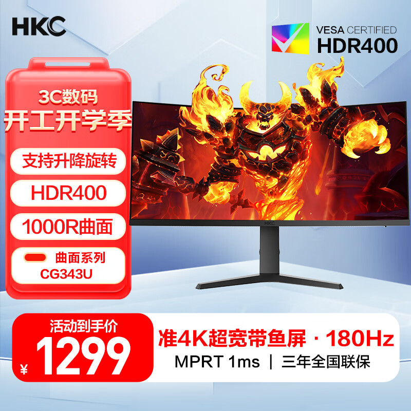 HKC 34英寸21:9带鱼屏WQHD准4K超清180Hz高刷1ms曲面1000R游戏电竞HDR400升降旋转显示器 猎鹰CG343U价格:1299.00元!