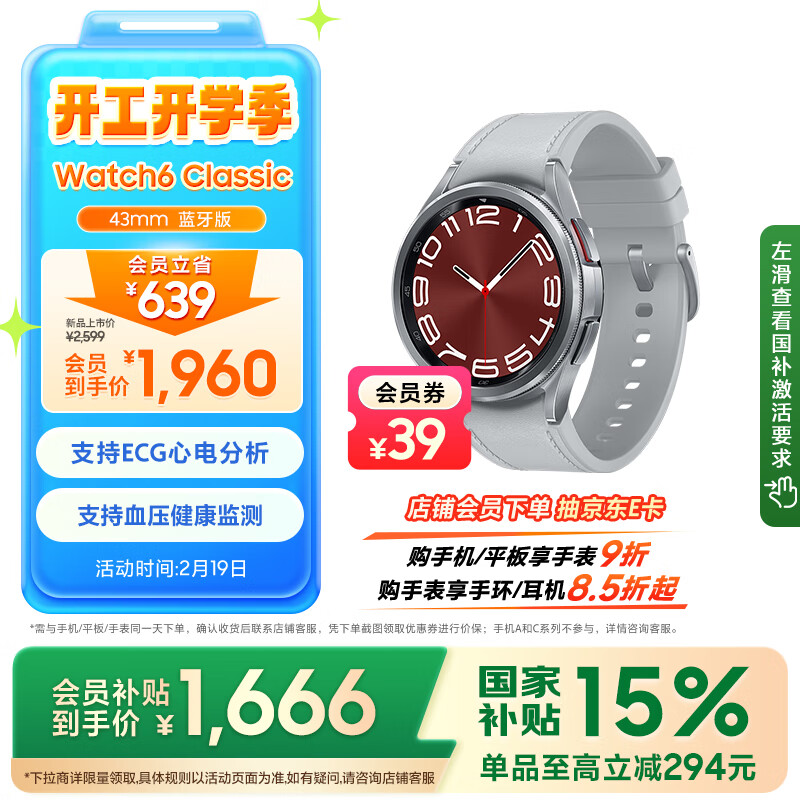 三星 Samsung【政府补贴】Watch6 Classic 蓝牙智能手表/运动手表/电话手表 43mm星系银男女表价格:1999.00元!
