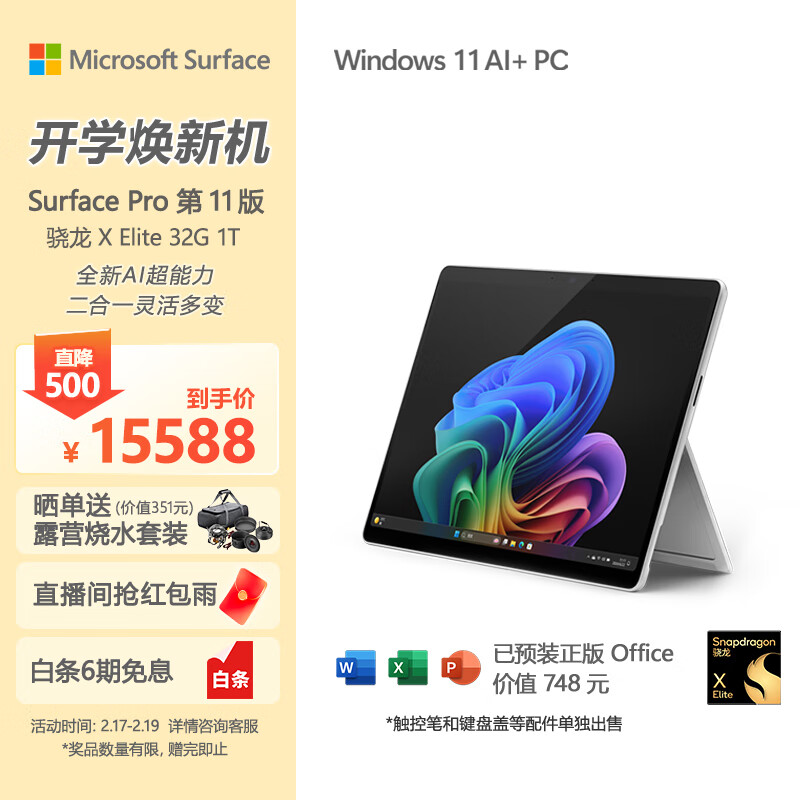 微软(Microsoft)全新Surface Pro第11版 二合一平板电脑笔记本办公平板 AIPC Pro11 骁龙X Elite 32G+1T 亮铂金价格:15588.00元!
