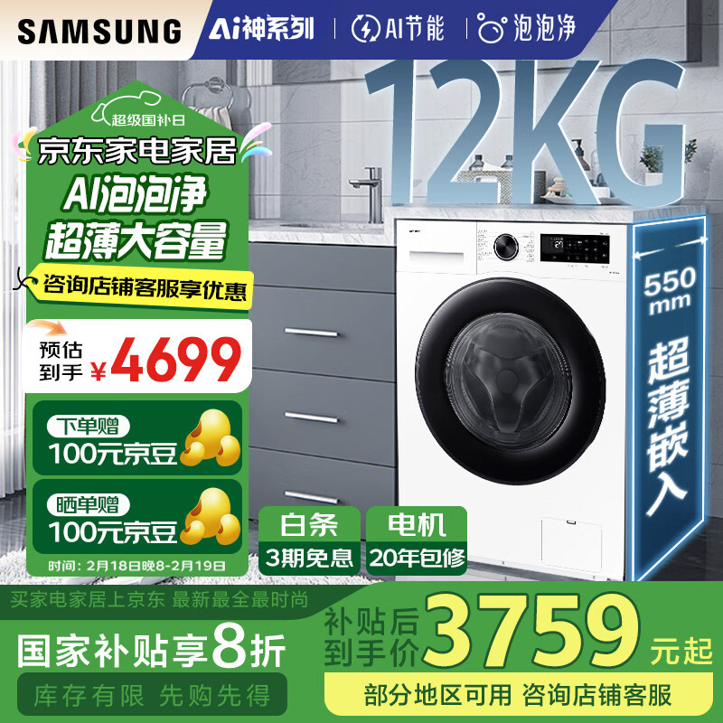 三星(SAMSUNG)AI神洗衣机5系 12KG全自动滚筒AI泡泡净蒸汽除菌超薄嵌入以旧换新补贴白WW12DG5B24AWSC价格:6499.00元!
