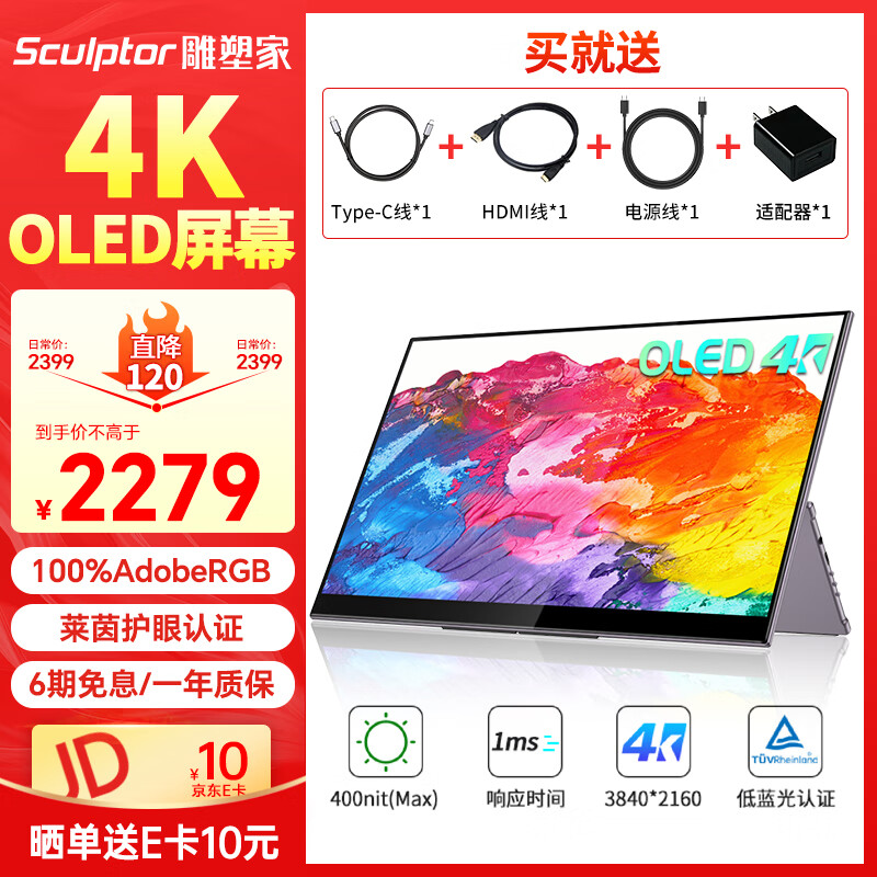 雕塑家15.6英寸4K OLED便携式显示器 100%AdobeRGB色域 手机电脑笔记本分屏 设计师移动拓展副屏MU156LO2价格:2279.00元!