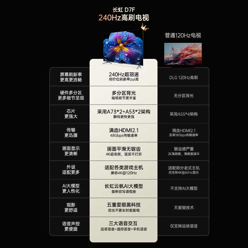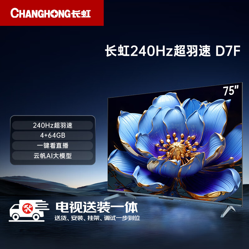 长虹电视75D7F 【包安装】75英寸4K超高清游戏电视 240Hz超羽速 4+64GB 一键看电视 智能平板液晶电视价格:3898.00元!