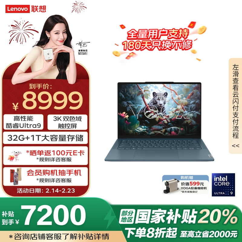 联想笔记本电脑YOGA Pro 14s AI高能本14.5英寸轻薄本酷睿Ultra9 32G 1T 3K高刷触控蓝【补贴20%】价格:8999.00元!