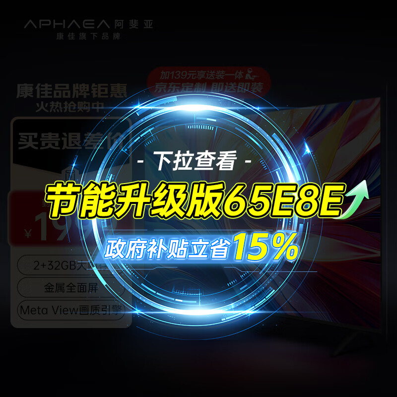 康佳阿斐亚电视 65E8 65英寸 2+32GB 4K超清屏 一键投屏 智能语音教育液晶平板电视机 以旧换新价格:1949.00元!
