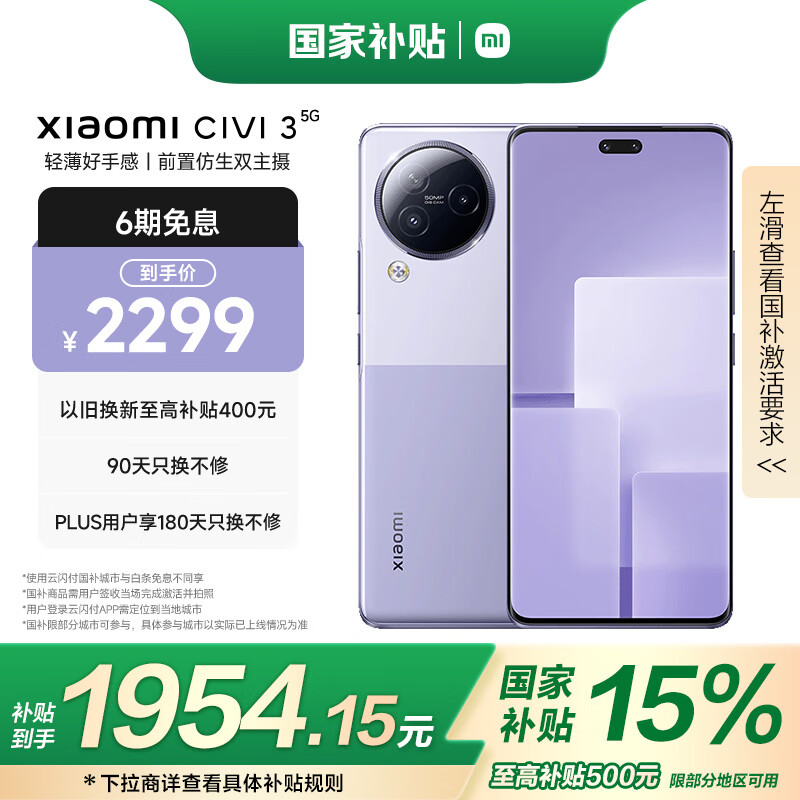 小米 Civi 3 前置仿生双主摄 光学防抖镜头 12GB+512GB 玫瑰紫 5g手机 补贴 5G手机国补价格:2299.00元!
