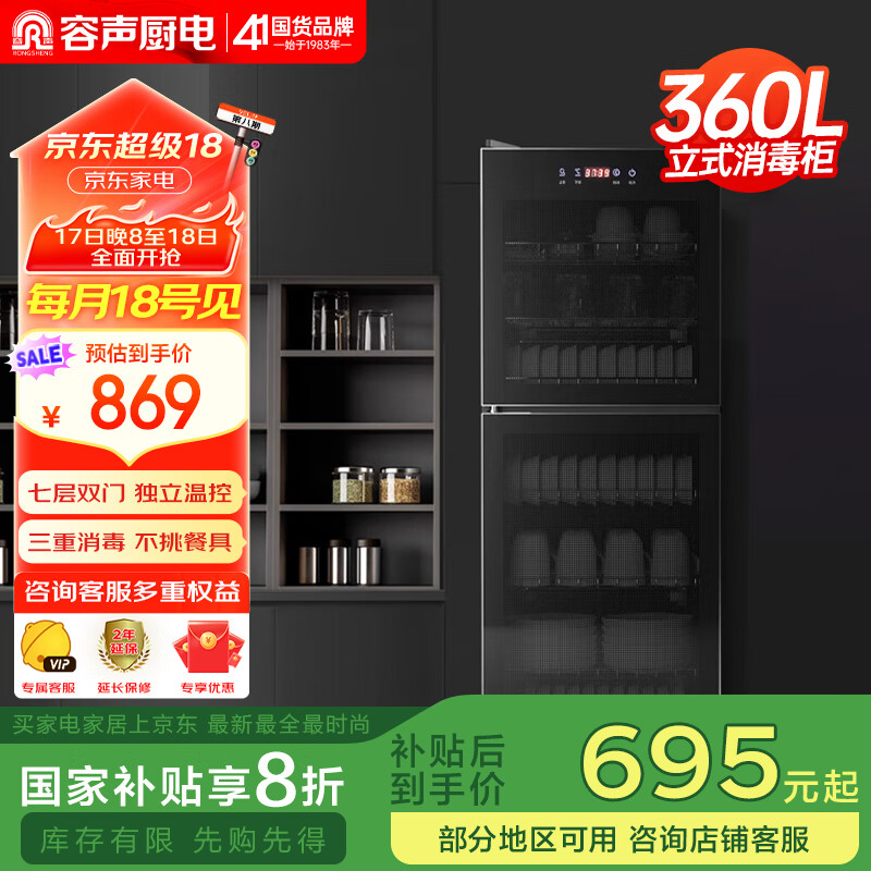 容声(RONGSHENG)消毒柜家用 立式 消毒碗柜 餐饮 双开门 家商两用 厨房商用 大容量360L消毒柜立式380-RD305S价格:859.00元!