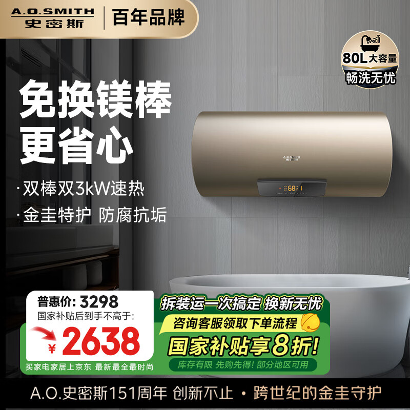 史密斯(A.O.SMITH)80升电热水器 补贴 终身免更换镁棒 金圭内胆 双棒双3kW速热 晶彩外观 遥控E80MDF价格:3298.00元!