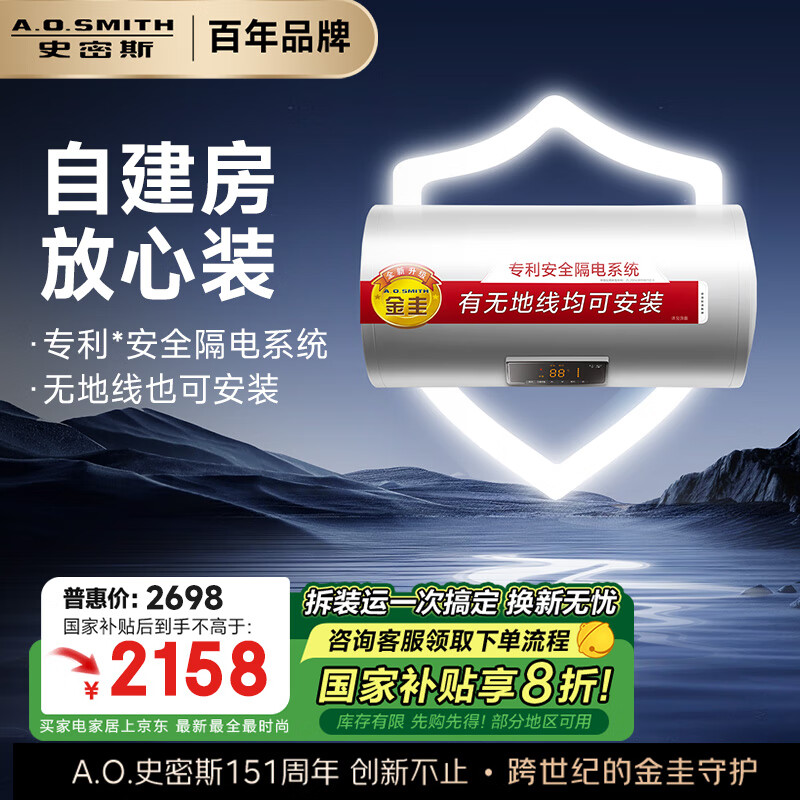 史密斯(A.O.SMITH)60升电热水器 补贴 无地线可安装 专利隔电 金圭内胆 速热节能 一键中温保温E60VDS价格:2698.00元!