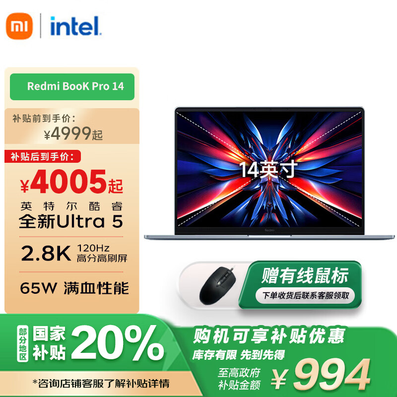 小米笔记本电脑 红米 RedmiBook Pro 14 2024 酷睿标压Ultra5 2.8K120hz高刷屏 轻薄本(16G 512G)灰价格:4998.00元!