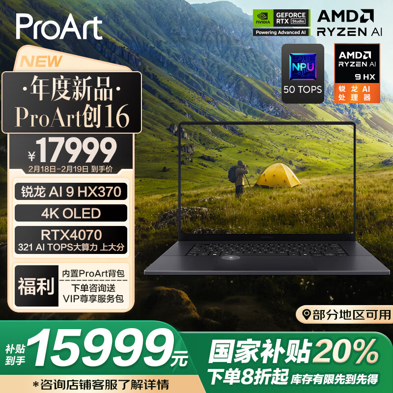 华硕ProArt创16 AMD锐龙AI 9 HX370 RTX4070 64G 2T 4K OLED触控屏轻薄游戏设计AI补贴20%电脑价格:17999.00元!