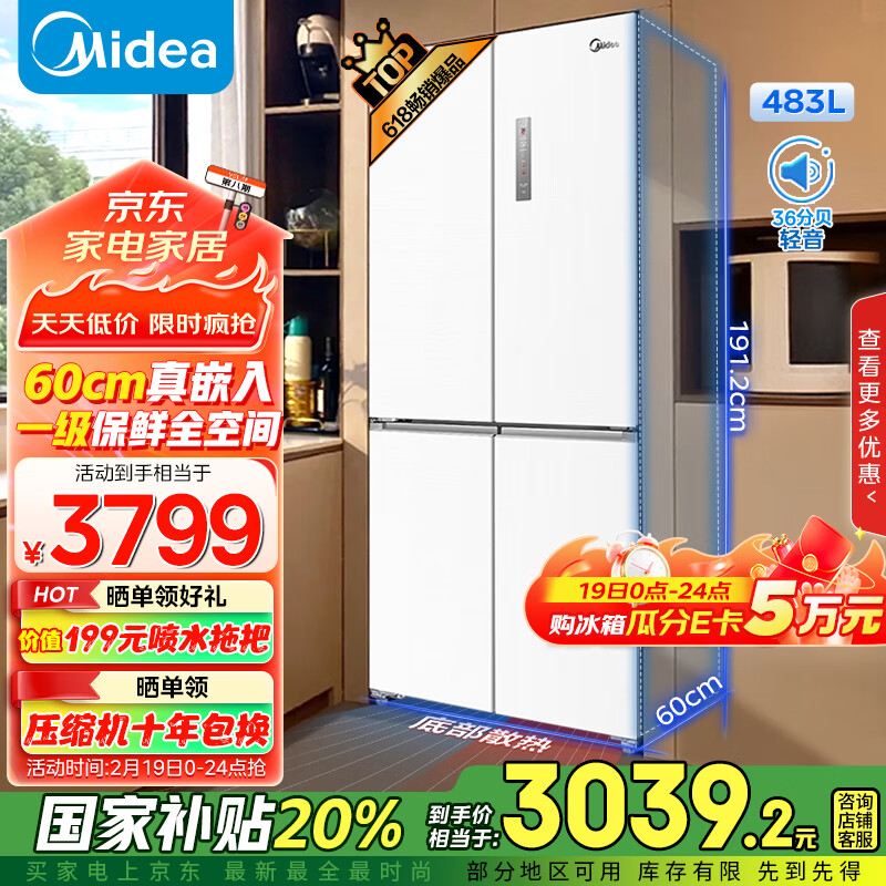 美的(Midea)483升纯平全嵌十字对开四开门底部散热一级能效风冷无霜补贴家用智能电冰箱BCD-483WSPZM(E)价格:3899.00元!