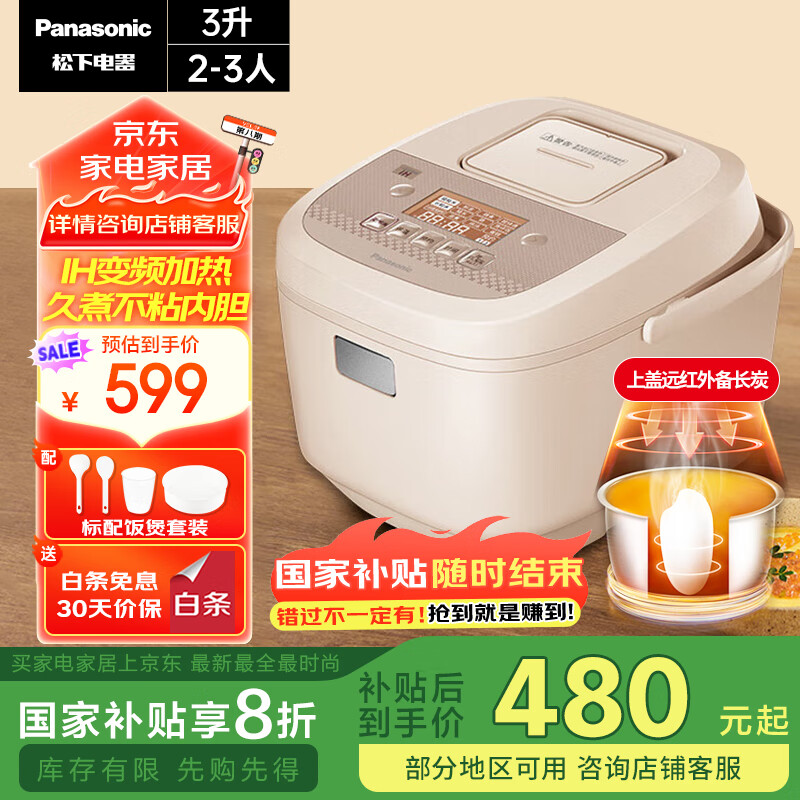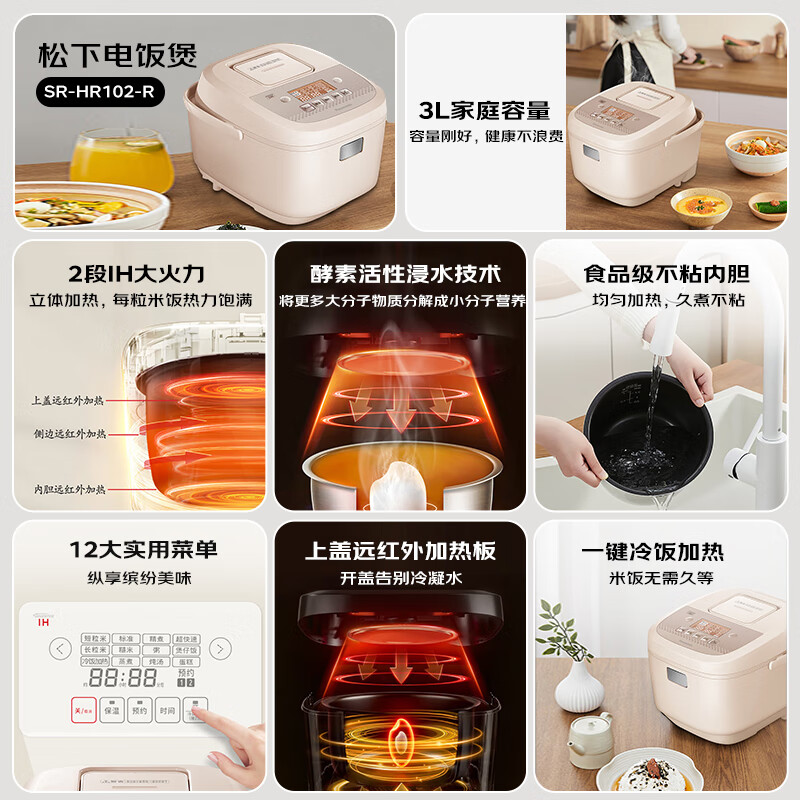 松下(Panasonic)电饭煲家用2-3人多功能IH电饭锅远红外加热煮饭锅智能预约一级能效3升容量SR-HR102-R价格:599.00元!
