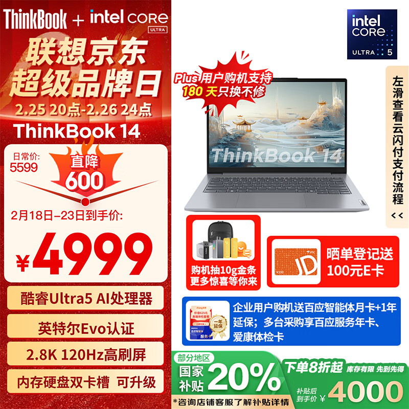 ThinkPad【补贴20%】联想笔记本电脑ThinkBook 14 英特尔Evo认证酷睿Ultra5 16G 1T 2.8K AI高刷屏办公价格:4999.00元!