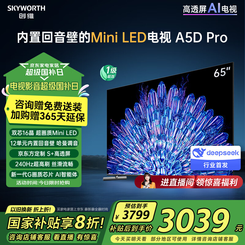 创维电视65A5D Pro 65英寸deepseek AI电视机 Mini LED 240Hz 内置回音壁液晶家电政府补贴20%价格:3799.00元!