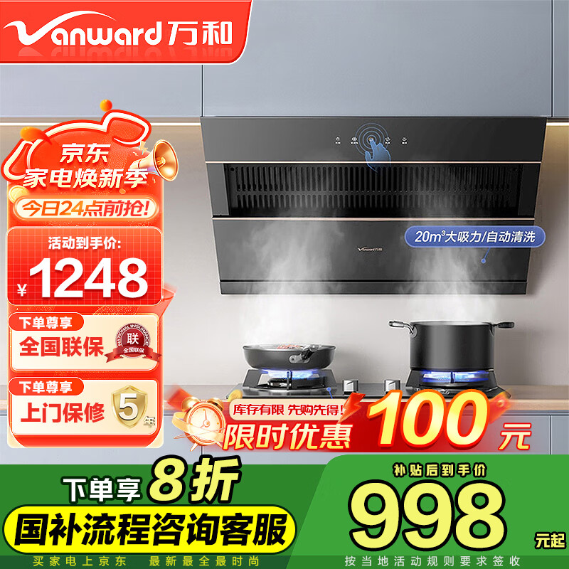 万和(Vanward)侧吸式抽油烟机 燃气灶套餐 21m3/min大吸力 一键自清洗 烟灶套装 钢化玻璃 J525S+B3L20(天然气)价格:1248.00元!