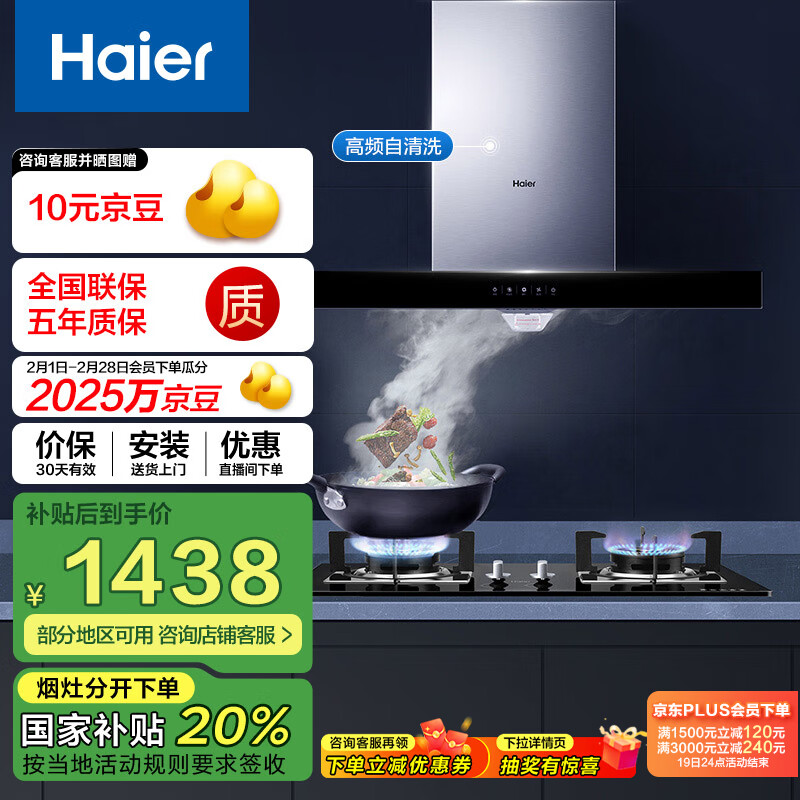 海尔(Haier)抽油烟机 烟灶套装 19m3/min大吸力420pa大风压高频自旋洗家用欧式5.2kW灶T3S+Q2BE3(天)价格:1798.00元!