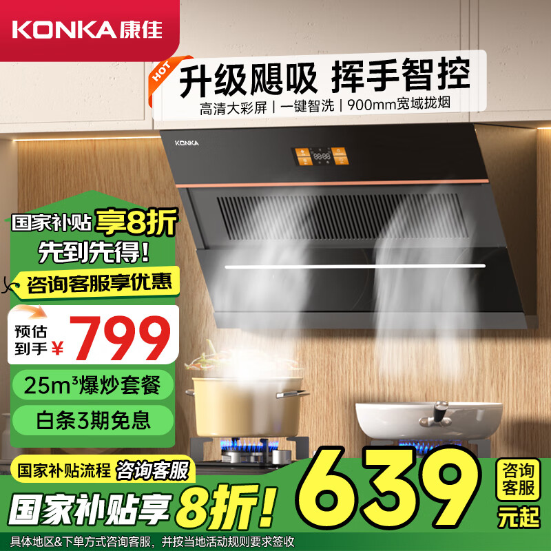 康佳(KONKA)抽油烟机家用侧吸式 25立方爆炒超大吸力 自清洁 挥手控制 彩屏面板 排烟机补贴 CXW-300-KJ88价格:799.00元!