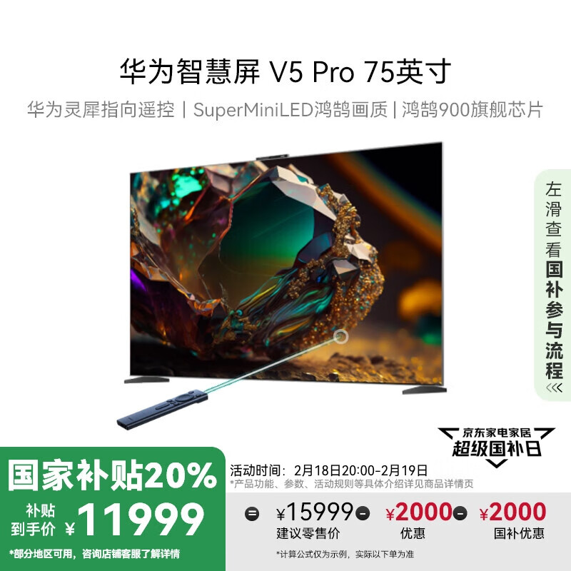 华为智慧屏 V5 Pro 75英寸 灵犀指向遥控MiniLED 4K超高清电视机以旧换新一级能效补贴HD75ARKA价格:13999.00元!
