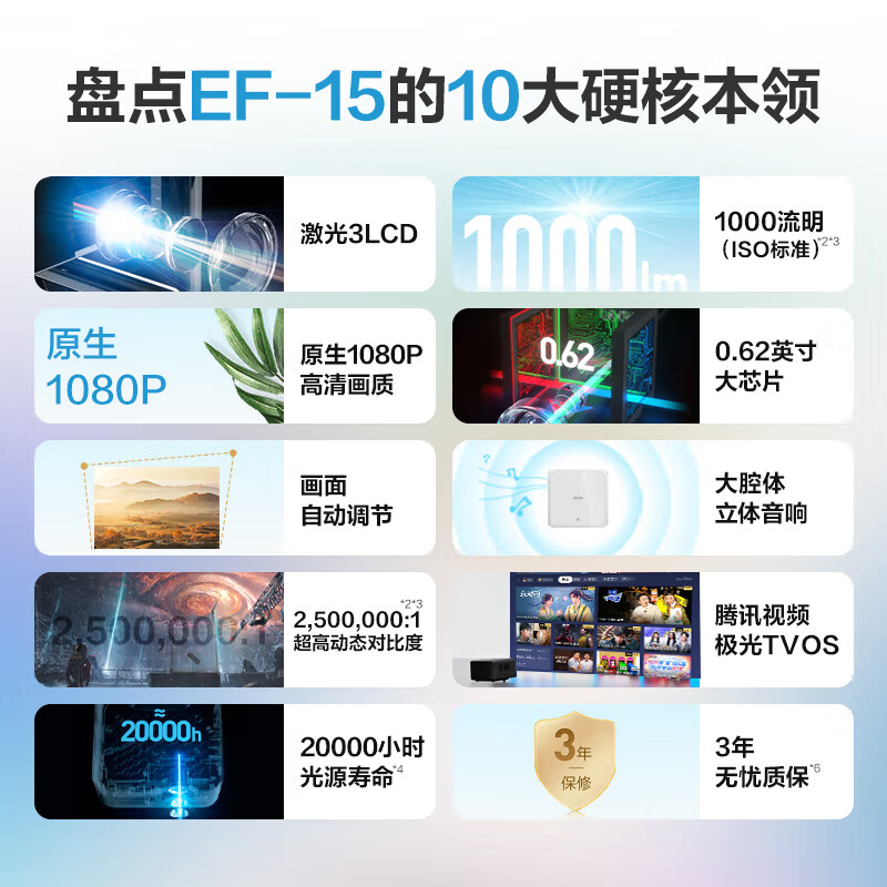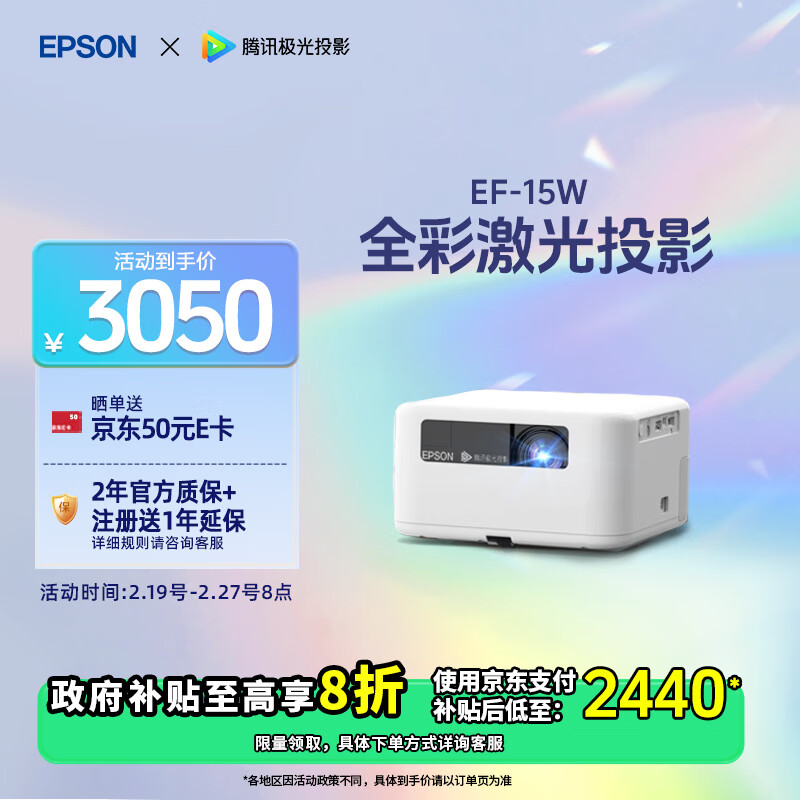 爱普生(EPSON)EF-15W 家用投影仪 3LCD高亮家庭影院智能投影机(0.62”大芯片 1000流明 激光)补贴价格:3050.00元!