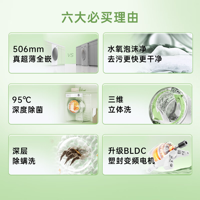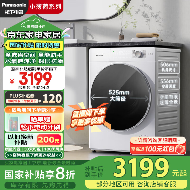 松下(Panasonic)滚筒洗衣机全自动 506超薄全嵌【小薄荷S】10公斤 水氧泡沫净 除菌XQG100-M1F5以旧换新补贴价格:3999.00元!